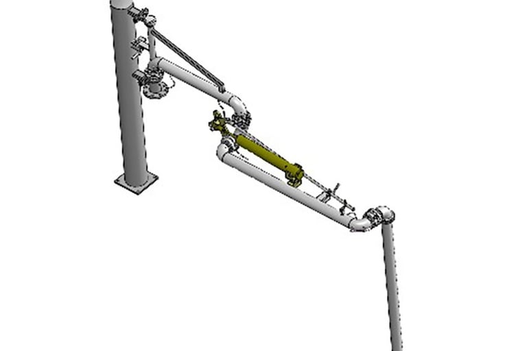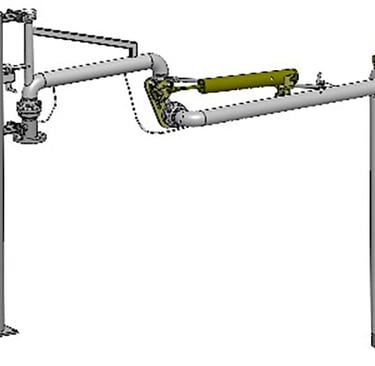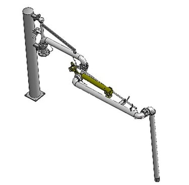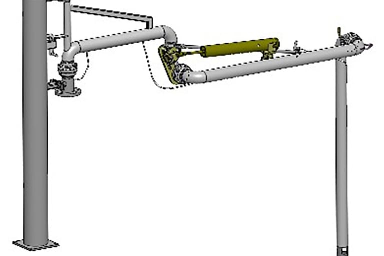 接口法兰朝下,适用于大部分工艺管线布局,适用于顶部敞口槽车的装卸操作,操作灵活,维修方便,使用广泛。最常规的鹤管结构型式,由管道、结构件及电气附件三部分构成,管道部分包含内臂、外臂、垂管。结构件部分包含支撑立柱、外臂平衡及内外臂锁紧机构组成,电气附件包含导静电带、液位计和归位感应开关(可选项)等组成。