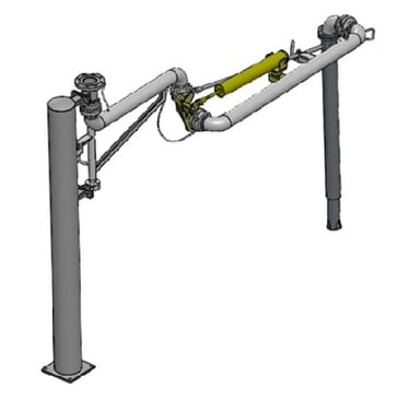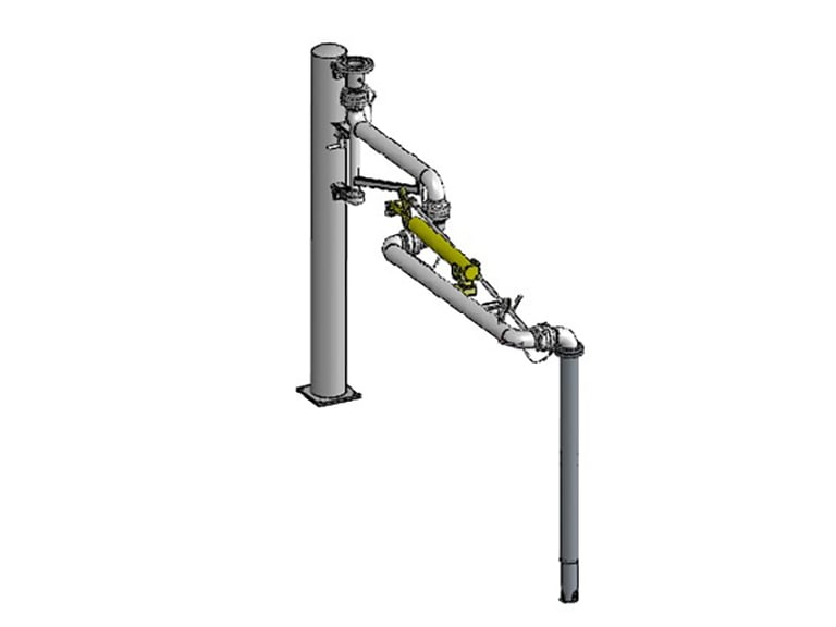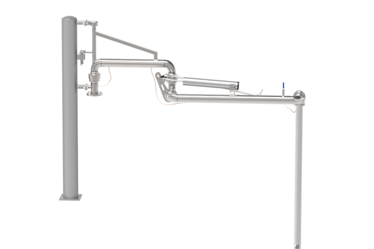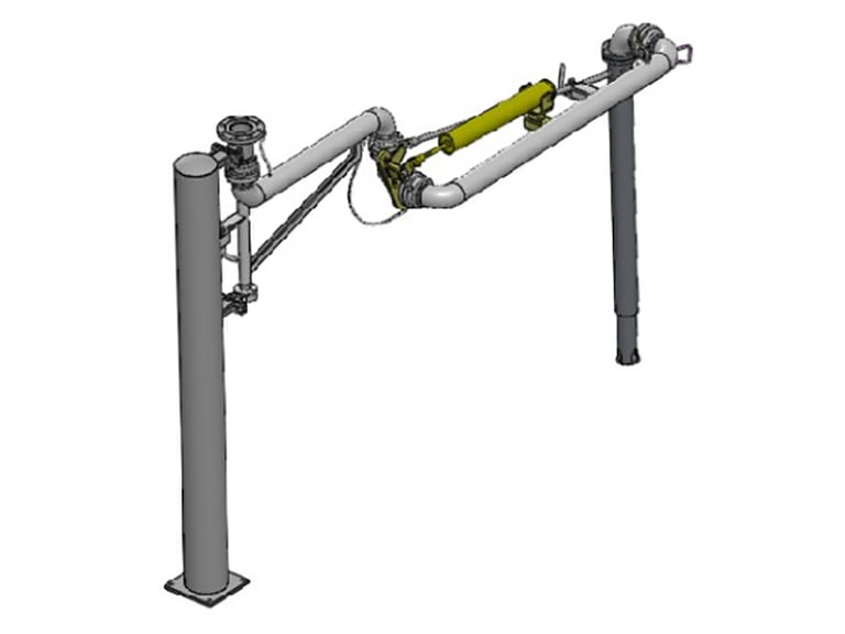 法兰接口朝上,配合高架管线,装车完毕介质残留较少。整体由管道、结构件及电气附件三部分构成。管道部分包含内臂、外臂、垂管。结构件部分包含支撑立柱、外臂平衡及内外臂锁紧机构组成,电气附件包含导静电带、液位计和归位感应开关(可选项)等组成。